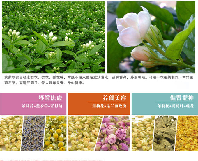 茉莉花茶產(chǎn)于廣西橫縣,其茶香與茉莉花香交互融合,有“窨得茉莉無(wú)上味,列作人間第香”的美譽(yù)。新中國(guó)成立以來(lái),橫縣茉莉花茶直是國(guó)家的外事禮茶。茉莉花茶是將茶葉和茉莉鮮花進(jìn)行拼和、窨制,使茶葉吸收花香而成的茶 。其香氣鮮靈持久、滋味醇厚鮮爽、湯色黃綠明亮、葉底嫩勻柔軟。經(jīng)過(guò)系列工藝流程窨制而成的茉莉花茶,具有安神、解抑郁、健脾理氣、抗衰老防輻射、提高機(jī)體免疫力的功效,是種健康飲品。