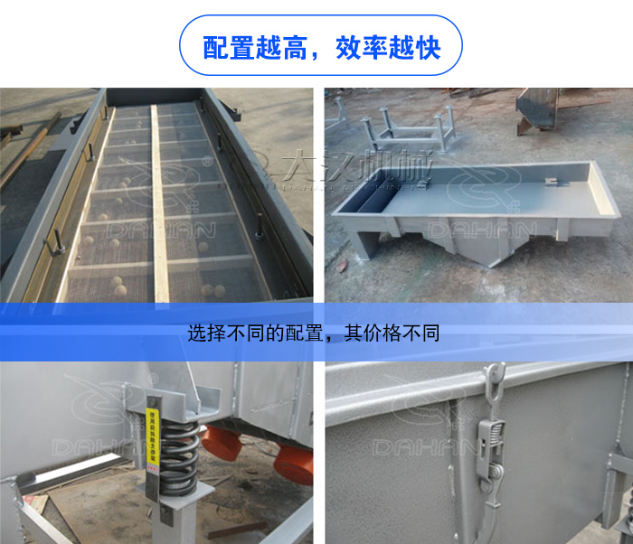 直線振動篩網架采用鋼制網架,投料口高于出料口10公分,電機采用優質的銅線,故障率低,根據用戶選擇,我們的石料直線振動篩可以選擇不同的配置,如篩網選擇不銹鋼或碳鋼篩網,還可以采用耐磨性更高的錳鋼,選擇不同的配置,其價格不同,具體根據用戶實際選擇為準。