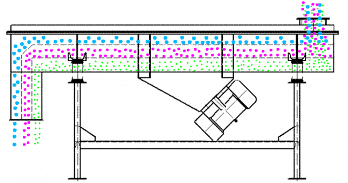 輕型直線振動篩采為雙振動電機驅動,當兩臺電機作同步、反向旋轉時,其偏心塊所產生的激振力在平行于電機軸線的方向相互抵消,在垂直于電機軸的方向疊為一合力,在激振力和物料自重力的共同作用下,使物料在篩面上被拋起向前作直線運動,從而達到篩分的目的。