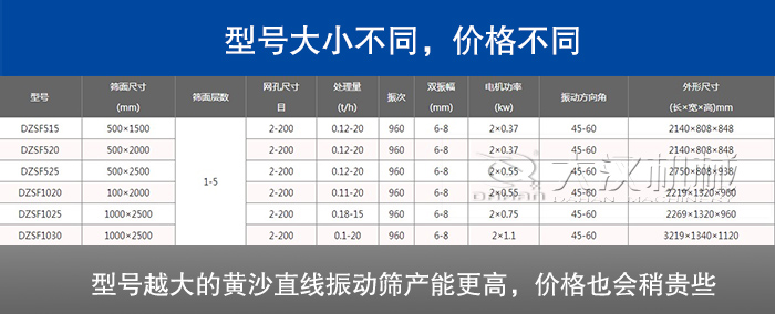 該設備型號有多種,每種型號的設備效率、產能、電機功率等各不樣,型號越大的黃沙直線振動篩產能更高,價格也會稍貴些,不過給客戶帶來的經濟利潤將會更顯著。