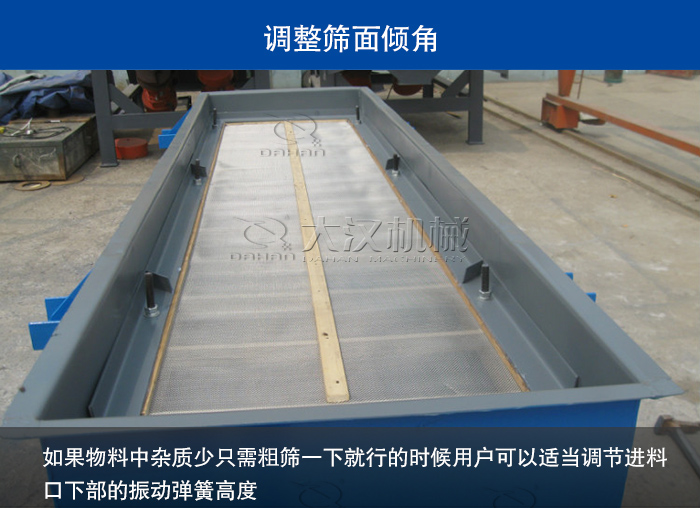 直線振動篩在設計時是有個傾斜角度的,通常情況下傾角為45°,但在實際使用過程中如果物料中雜質少只需粗篩下就行的時候用戶可以適當調節(jié)進料口下部的振動彈簧高度,進料口高度升高可以加快物料在篩面的運動從而實現(xiàn)提高產(chǎn)量的效果。