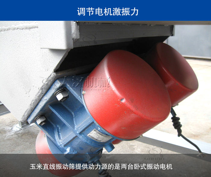 玉米直線振動篩提供動力源的是兩臺臥式振動電機,在設備出廠時電機的激振力是根據(jù)用戶提供數(shù)據(jù)調節(jié)好的,在實際使用過程中如出想提高產(chǎn)量也可通過調節(jié)兩臺電機偏心重錘的方式增加激振力實現(xiàn)提高產(chǎn)量。這里要注意的時在調節(jié)激振力前請先咨詢您的供應商再進行合理調節(jié)。