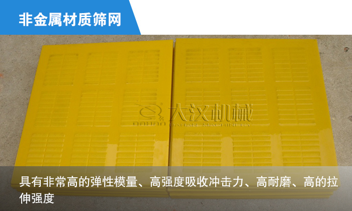 ④非金屬材質(zhì)的振動篩篩網(wǎng)中,聚氨酯為常見,因為聚氨酯本身具有非常高的彈性模量、高強度吸收沖擊力、高耐磨、高的拉伸強度,因此其承載力較高,是橡膠篩板的 2.5 倍以上,使用壽命與普通金屬篩板相比提高8-10倍,是不銹鋼篩面的3倍,是天然橡膠的3.9倍,是當前耐磨性能較好的振動篩篩網(wǎng)材料。
