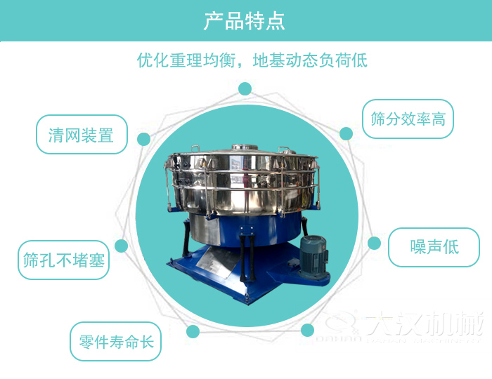 旋振篩,其原理是:瞬時(shí)運(yùn)動(dòng)為沿徑向的位移和以此位移為軸的圓周運(yùn)動(dòng)的合成(螺旋運(yùn)動(dòng))。即可調(diào)節(jié)偏心距的激振器產(chǎn)生了非線性三維運(yùn)動(dòng),物料也產(chǎn)生同樣的近似手動(dòng)作業(yè)的運(yùn)動(dòng),從而達(dá)到篩分之目的,再配合篩分附件可得到更加理想的篩分效果;適合于圓球狀、圓柱狀、片狀、乃至不規(guī)則形狀易堵網(wǎng)且需要精密篩分的物料。