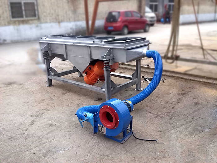 大漢機(jī)械降溫直線振動(dòng)篩這對(duì)高溫特性物料設(shè)計(jì)研發(fā),可在有效降低物料溫度后再對(duì)物料進(jìn)行篩分,有效的提高了篩分效率及處理量,下面以洗衣粉為例說(shuō)明風(fēng)冷式振動(dòng)篩的應(yīng)用。洗衣粉在剛剛完成生產(chǎn)后,通常為120度左右的高溫,如不進(jìn)行降溫處理,篩選分級(jí)非常困難,而洗衣服不適合傳統(tǒng)的水冷式降溫。在洗衣粉生產(chǎn)線上用“大漢牌”降溫式直線振動(dòng)篩,剛生產(chǎn)完成120度高溫洗衣粉通過(guò)輸送設(shè)備直接進(jìn)入風(fēng)冷式直線振動(dòng)篩,經(jīng)過(guò)安裝在設(shè)備進(jìn)料口底部的風(fēng)機(jī)降溫冷卻系統(tǒng),(不符合要求的結(jié)塊物料通過(guò)安裝在進(jìn)料口端的篩網(wǎng)篩選后從出料口旁的小型排料口排出,見(jiàn)下圖,該裝置可根據(jù)物料特性選裝),可直接將洗衣粉溫度降至40-50度后再進(jìn)入直線振動(dòng)篩完成篩選分級(jí)工作。